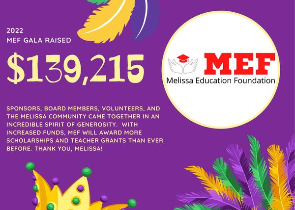 MEF, founded in 2006, raises funds each year for scholarships and teacher grants. To date, the organization has awarded more than $1 million to Melissa ISD students and teachers.